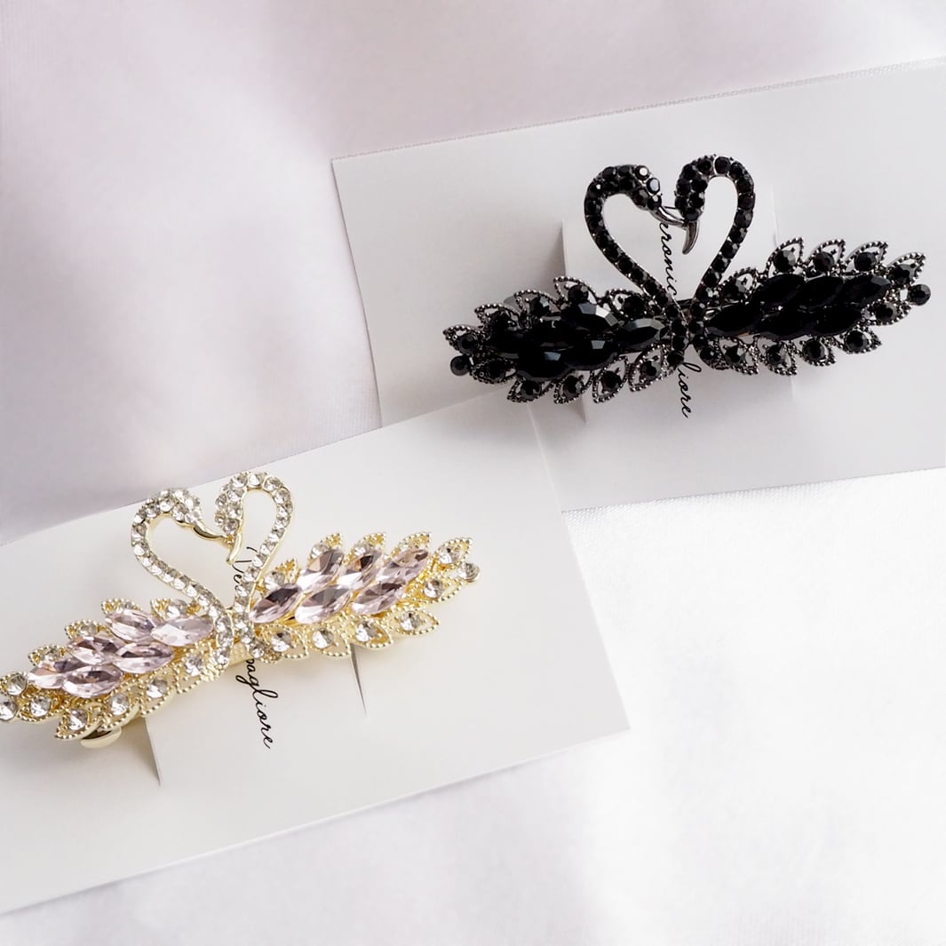 スワンが向かい合うデザインにキラキラと光るビジューを添えたバレッタ。可憐な雰囲気を演出します。
